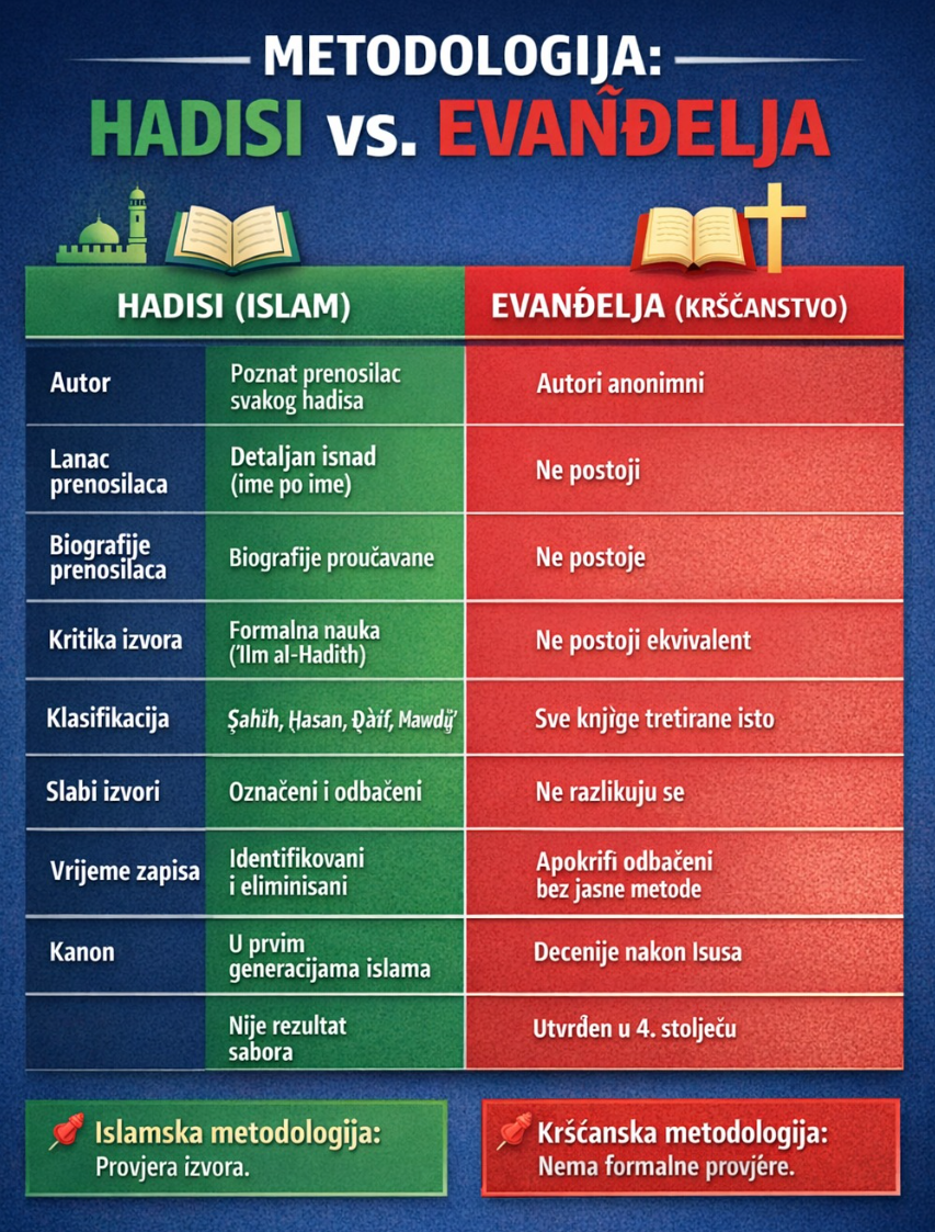 opet ne shvatas stvari.... Hadisi koji su u tim zbirkama su postojali i prije tih zbirki, ono sto je uradjeno jeste da su piscu ti zbirki samo sakupili te hadise , analizirali, validirali i ocijenili , stavili u kategorije, ko je sta prenio, da li je hadis slab ili dobar ili autentican itd...imaju kategorije.... pa su zbirke koje danas koristimo nastale 180-250 godina poslije u ovom formatu koje koristimo danas....a ne da su pisani hadisi tad, oni su ih samo sakupili u te zbirke. to ti ja kazem, samo st oti nisi svjestan sta pises bas....i na sta sve impliciras... oni su radili valorizaciju hadisi, klasificirali ih, i stavili u kategorije, sa lancima prenosilaca itd....a hadisi su zapisivani jos za vrieme Muhammeda ako nisi znao, da ne pomisljas da su prvi hadisi pisani tek 180-250 jer to ti ovdje hoces da impliciras, da nista nije pisano prije ovih zbirki, a jeste cak jos za vrijeme Muhammeda nije tacno, hadisi su zapisivani jos za vrijeme Muhammeda.