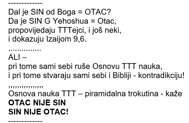 . IZAIJA 9,5 – SIN = BOG OTAC ??? SIN od Boga Jedinoga OCA YHVH, G Yehoshua – lažno zvan Isusek da je = OTAC ??? ======== IZAIJA 9,5 Jer, DIJETE nam se RODILO, SINA DOBISMO; na plećima mu je vlast. Ime mu je: Savjetnik divni, BOG SILNI, OTAC VJEČNI, Knez mironosni. ------------- Dal je SIN od Boga = OTAC? Da je SIN G Yehoshua = Otac, propovijedaju TTTejci, i još neki, i dokazuju Izaijom 9,6. ............... ALI – pri tome sami sebi ruše Osnovu TTT nauka, i pri tome stvaraju sami sebi i Bibliji - kontradikciju! ,,,,,,,,,,,,,,,, Osnova nauka TTT – piramidalna trokutina - kaže OTAC NIJE SIN SIN NIJE OTAC! ------------- Sam SIN G Yehoshua kaže - Otac je veći od mene. Bog YHVH Otac je Yehoshui - glava! Kako onda mogu biti ISTI?! -------------- Najvažnije od svega! Da li je Izaija 9,6 – proroštvo za SINA G Yehoshuu lažno zvanoga Isusek? . Ako – je! - GDJE je u NZ Ispunjenje toga proročanstva? . Gdje su SINA G Yehoshuu u NZ zvali: . BOŽE Yehoshua SILNI OČE Yehoshua VJEČNI? . U kojem NZ stihu Yehoshui daju TA zvanja? . Kad je sam SIN G Yehoshua reko: . JA SAM BOG SILNI ! JA SAM OTAC VJEČNI ! ,,,,,,,,,,,,,,,,, Da li je Izaija LAŽNI prorok, jer se TO proroštvo NIJE obistinilo ILI je stih KRIVO USMJERAVAJUĆE PREVEDEN? --------------- Pogledajmo ovaj prijevod - ispravni - jer nije kontradiktoran kao "oficielni". Ovako bi Židovi preveli taj stih. --------------- IZAIJA 9,5 Jer nam se rodi Dijete, = SIN G YEHOSHUA - sin = SIN G YEHOSHUA - nam se dade, = BOG YHVH DAO SVOGA SINA - i na ramenu svome imat će vlast; ---------------- i --------------- divni Savetnik, = BOG JEDINI OTAC YHVH - silni Bog, = BOG JEDINI OTAC YHVH - vječni Otac, = BOG JEDINI OTAC YHVH - dade mu ime: ---------------- "Knez mira". ----------------
