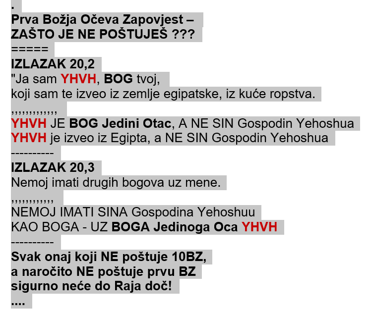 . TKO JE TVOJ BOG ??? ======= Najteže pitanje za 90% današnjih SAMOZVANIH Kršćana! ======= Tko je tvoj Bog? Da li je tvoj Bog – Biblijski Bog? Kako Mu je Ime? ----------- Dokaži svoju tvrdnju sa 2-3 istoznačna ne dvosmislena Biblijska STIHA tipa - Ime Boga je…………… U ispravno prevedenoj Bibliji postoji zapisano Sveto Ime Boga Jedinoga - YHVH – NA 7.000 mjesta !!! ---------- ILI TKO SU SVE TVOJI bogovi? ===== . Prva Božja Očeva Zapovjest – ZAŠTO JE NE POŠTUJEŠ ??? ===== IZLAZAK 20,2 "Ja sam YHVH, BOG tvoj, koji sam te izveo iz zemlje egipatske, iz kuće ropstva. ,,,,,,,,,,,,, YHVH JE BOG Jedini Otac, A NE SIN Gospodin Yehoshua YHVH je izveo iz Egipta, a NE SIN Gospodin Yehoshua ---------- IZLAZAK 20,3 Nemoj imati drugih bogova uz mene. ,,,,,,,,,,,, NEMOJ IMATI SINA Gospodina Yehoshuu KAO BOGA - UZ BOGA Jedinoga Oca YHVH ---------- Svak onaj koji NE poštuje 10BZ, a naročito NE poštuje prvu BZ sigurno neće do Raja doč! ....