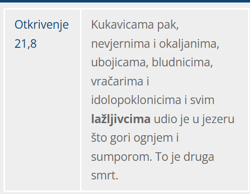 ... Imaš tvrdnju! Oklen ti je? Jel iz ZEMLE črne ILI iz BIBLIJE? --------------------- Ako je iz Biblije – onda daj stihove – gdje TO piše. Biblija kaže – svjedočanstvo je istinito – ako se temelji na - 2 – 3 ista svjedočenja!! Jer – odakle ti TO znanje? ,,,,,,,,,,,,,,,,,,,,,,,,, ALI – ako takovih stihova NEMA a NEMA ih ti si izmišljivač neistine! Ti daješ nešto što NIJE od Boga, a time je TO – od Oca Laži Sotone! -------------------- Zato ti Bog poručuje: OTKRIVENJE 21,8 Kukavicama pak, nevjernima i okaljanima, ubojicama, bludnicima, vračarima i idolopoklonicima i svim LAŽLJIVCIMA udio je u jezeru što gori ognjem i sumporom. To je druga smrt. Ispravi svoje krive putove!!!
