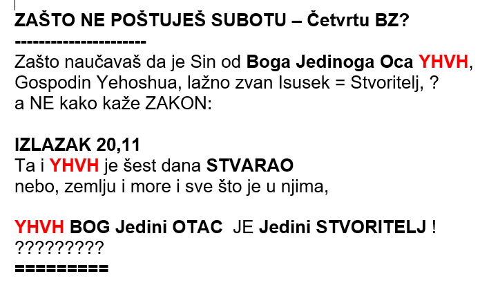 . GDJE U istinitoj Božjoj Očevoj YHVH Riječi – BIBLIJI, PIŠE – koji stih; --------------------- 1. Da je Božji SIN Yehoshua, lažno zvan Isusek, Pomazanik = Krist, za sebe rekao da je On Bog? Gdje je Yehoshua rekao – Ja sam Bog! - ? 2. Da je Sveti Duh za sebe rekao da je On Bog? Gdje je SD rekao – Ja sam Bog! - ? 3. Da je Božji SIN Yehoshua Pomazanik za sebe rekao da je On sve stvorio? Gdje je Yehoshua rekao – Ja sam stvorio…….! Ja sam Stvoritelj! - ? 4. Da je Sveti Duh za sebe rekao da je On sve stvorio? Gdje je SD rekao – Ja sam stvorio…….! Ja sam Stvoritelj! - ? 5. Da je Božji SIN Yehoshua Pomazanik za sebe rekao da se ljudi trebaju Njemu klanjati kao Bogu? 6. Da je Sveti Duh za sebe rekao da se ljudi trebaju Njemu klanjati kao Bogu? 7. Da je Božji SIN Yehoshua Pomazanik za sebe rekao da je On Alfa i Omega? Gdje je Yehoshua rekao – Ja sam A&0! - ? 8. Da je Sveti Duh za sebe rekao da je On Alfa i Omega? Gdje je SD rekao – Ja sam A&0! - ? 9. Trojstvo, 3 Božanske Osobe, Trojedini Bog, Trojednaki, BogoČovjek, Bog u tijelu, Bog se rodio, BogoRodica...? 10. Bog Otac Bog SIN Bog SD? 11. Da za spasenje treba vjerovati da je SIN Yehoshua Pomazanik = Bog? 12. Da za spasenje treba vjerovati da je SD Bog? 13. Da za spasenje treba vjerovati u TTT? ------------- Da li imaš jasne nedvosmislene stihove za gornje??? Jer to gornje je temelj tvoje vjere!!! Ako ti je to temelj – onda imaš u Bibliji masu takovih stihova. ALI – ako nema takovih stihova - a NEMA IH – onda tvoj nauk nije Biblijski. Onda ti imaš dogmatski nauk – NE-Biblijski. A pošto NIJE Božji Očev YHVH, onda je od Oca Laži! Biblija jasno kaže na mnogo mjesta - NE DODAJI NE ODUZIMAJ NE PREKO NAPISANOGA!!! ---------